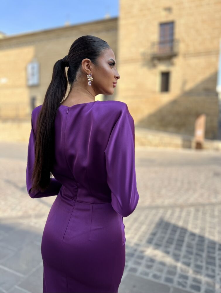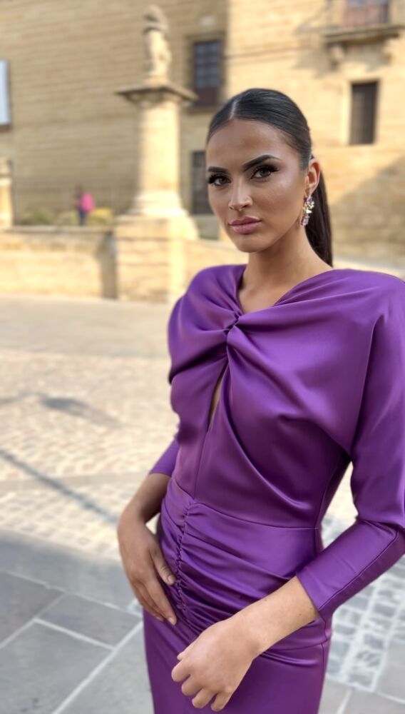 Vestido midi en tejido satén forrado al tono de color morado. El toque de distinción lo marca los drapeados de la zona frontal y el “cut” de pecho que deja ver de manera sutíl la piel. La raja frontal en falda es muy femenina marcado la silueta.