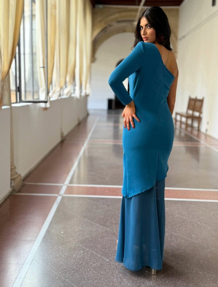 Vestido largo en tejido crepe forrado al tono de color azul. El toque de distinción lo marca la asimetría de la manga con la hombrera marcada y la falda en doble tejido con terminación en gasa.