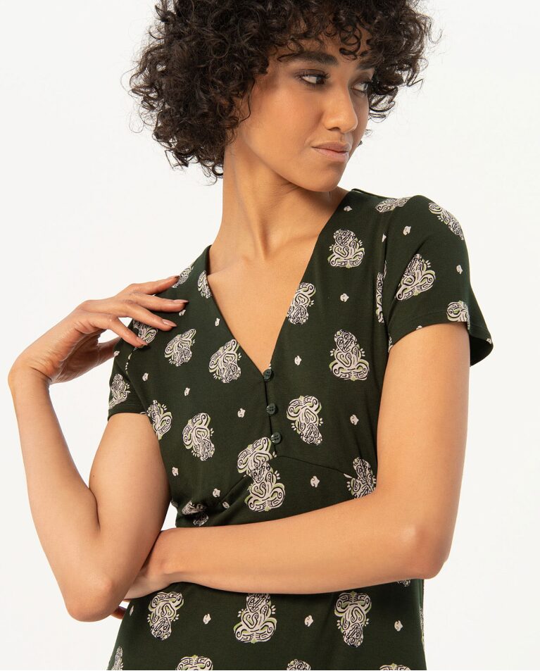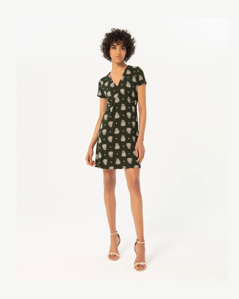 Vestido corto de escote pico con detalle de botones y manga corta. Estampado en tonos kaki y blanco. Composición 95% viscosa ecovero y 5% elastano.
