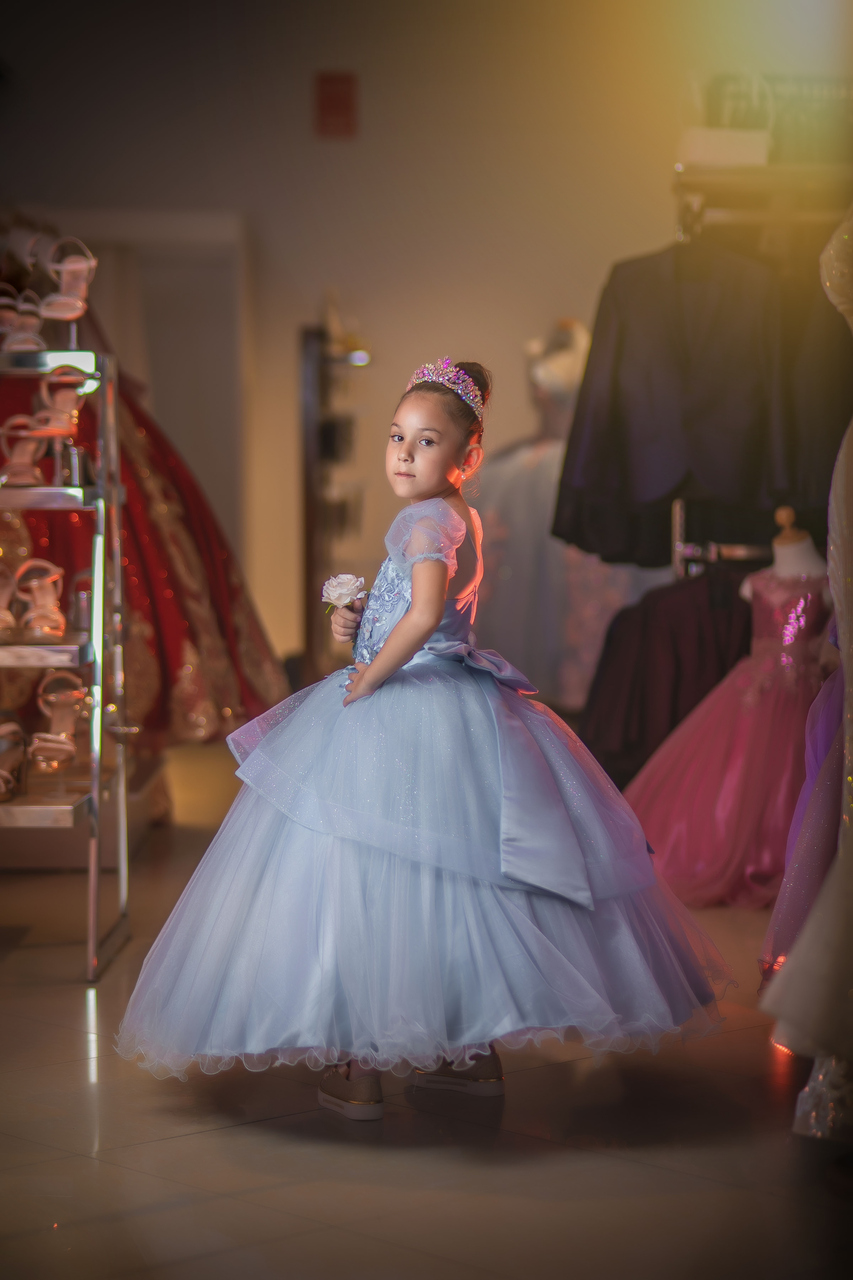 Vestido de niña en color celeste con hombro princesa, guipur y flores 3D en color celeste, lleva sobrefalda en glitter para dar ese toque delicado de elegancia y fineza.