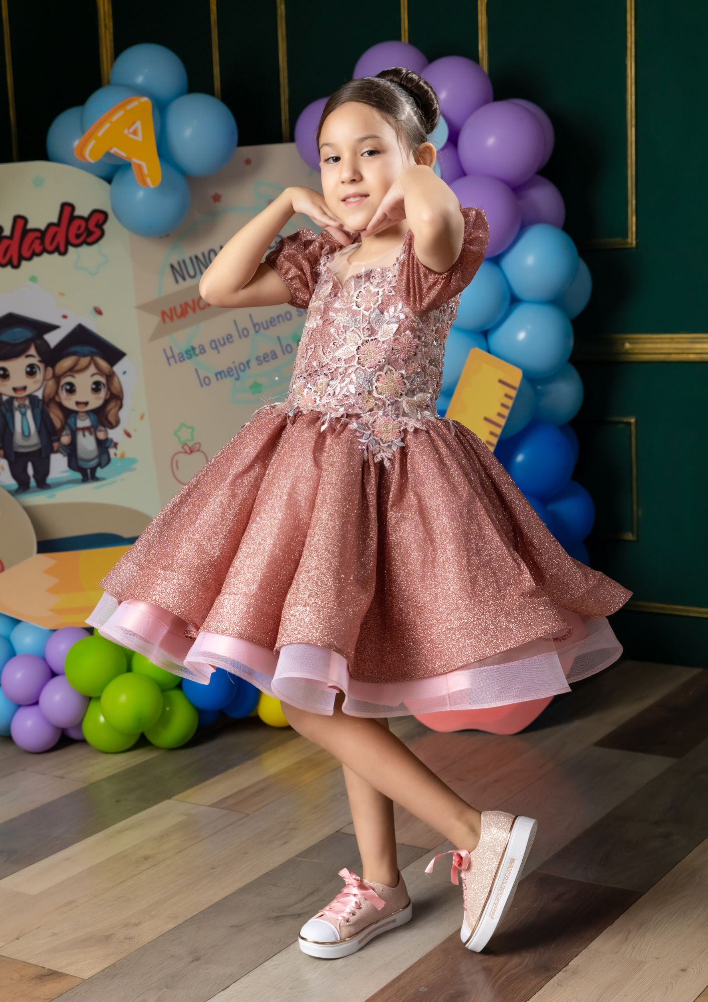 Vestido con escote corazón en guipur floral, con mangas abullonadas y falda en dos secciones en tela de arena de mar y tul fantasía para un toque elegante.