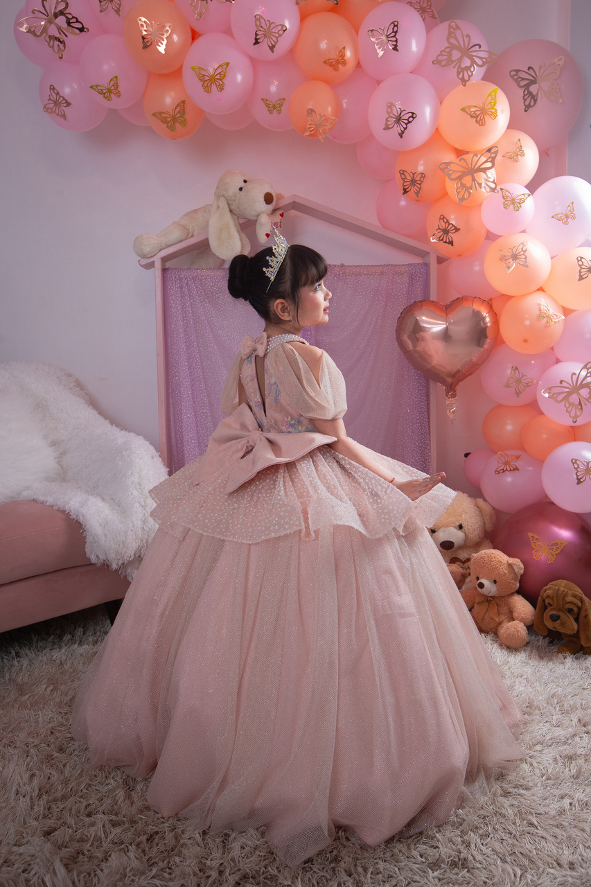 Vestido de niña Perlas de Rubor en cuello halter, delicadamente decorado con delicadas aplicaciones de perlas y un elegante moño en la parte trasera. La pechera luce mangas caídas con detalles en guipur floral que destacan su diseño romántico. La espalda presenta un escote en forma de ojal con acabados en guipur. La falda, amplia y voluminosa, incluye una sobrefalda en tela zafiro que realza su caída y complementada con un moño desmontable en la parte trasera.