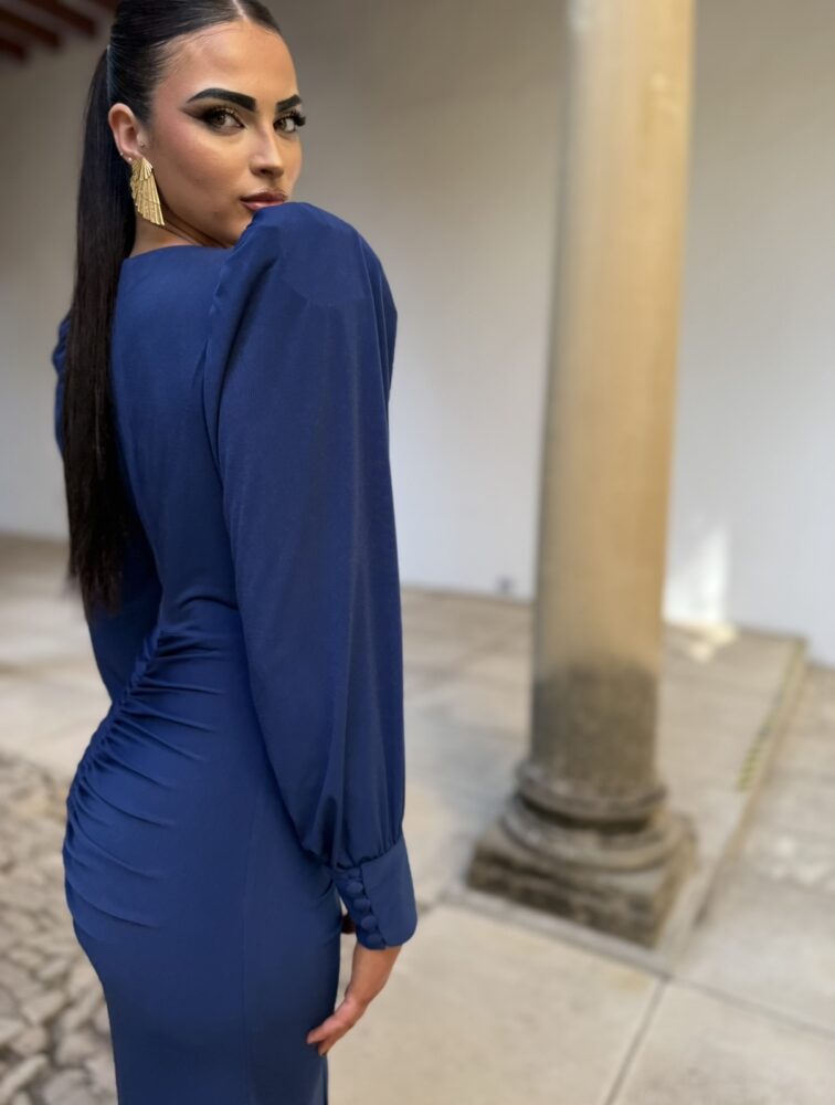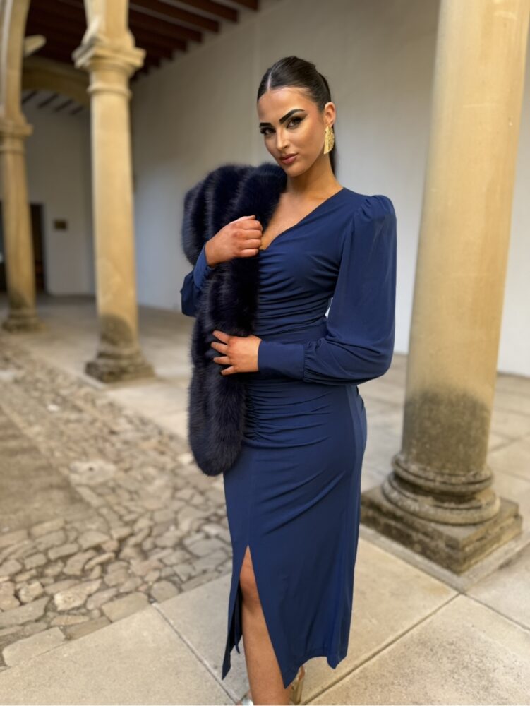Vestido midi en tejido punto de seda de color azul marino forrado al tono. El toque de distinción lo marca el escote pico, el drapeado frontal y trasero tan original y la raja frontal en falda. Un vestido muy elegante para brillar como invitada perfecta.