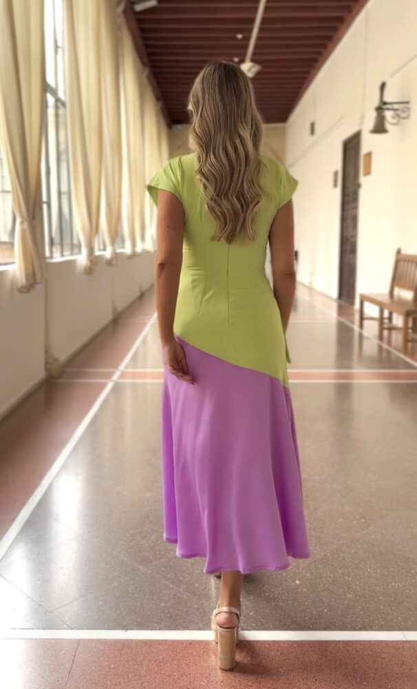 Vestido midi en tejido crepe fluido forrado al tono de color verde y morado. El toque de distinción lo marca la combinación de colores, el “cut” en pecho y la lazada en cintura. La parte inferior de la falda está fabricada en tejido satén morado. Un vestido súper elegante para brillar como invitada perfecta.