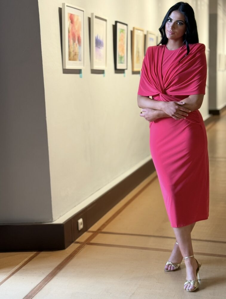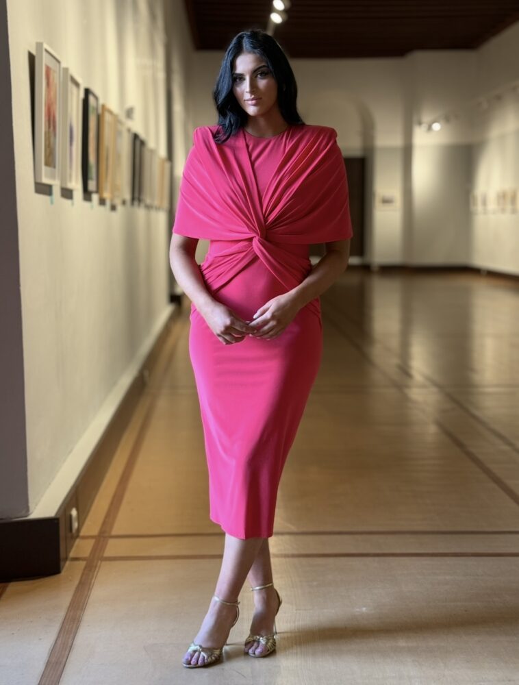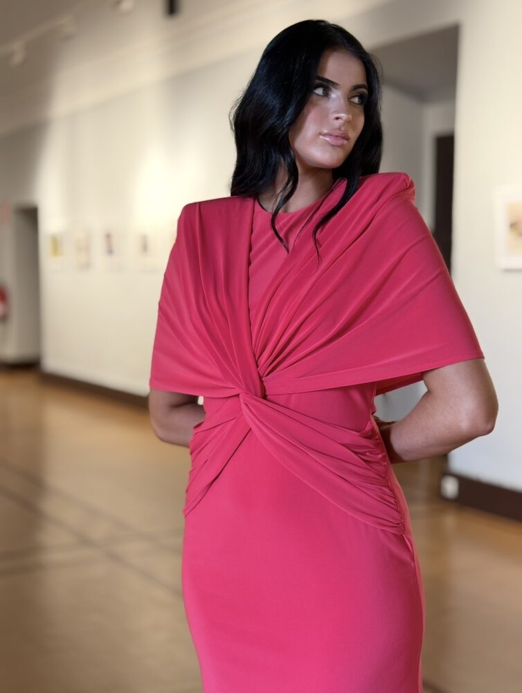 Vestido midi en tejido punto de seda de color coral forrado al tono. El toque de distinción lo marca el anudado en pecho, la originalidad del diseño en la zona superior simulando a una capa y la raja trasera. ¡Un vestido perfecto para ser la invitada perfecta!