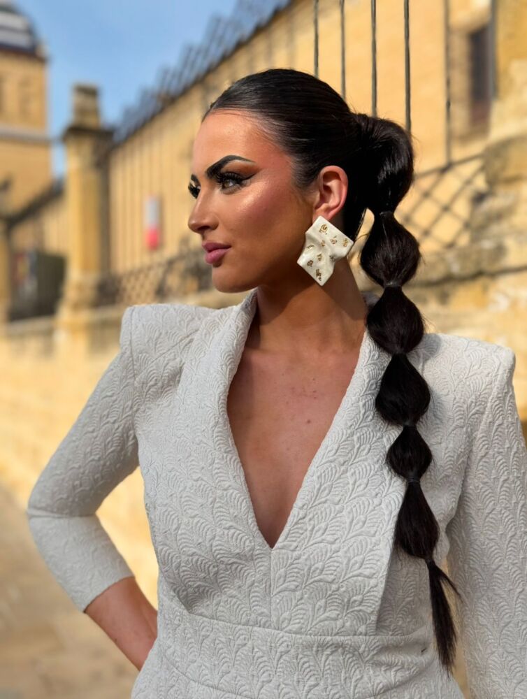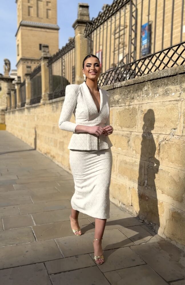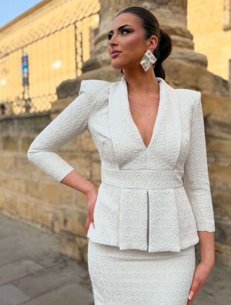 Vestido midi en tejido piqué forrado al tono de color crema. El toque de distinción lo marca el peplum en cintura disimulando tripa, el escote pico y la raja trasera. Un vestido ideal para madres de comunión, bautizo o novias civiles.