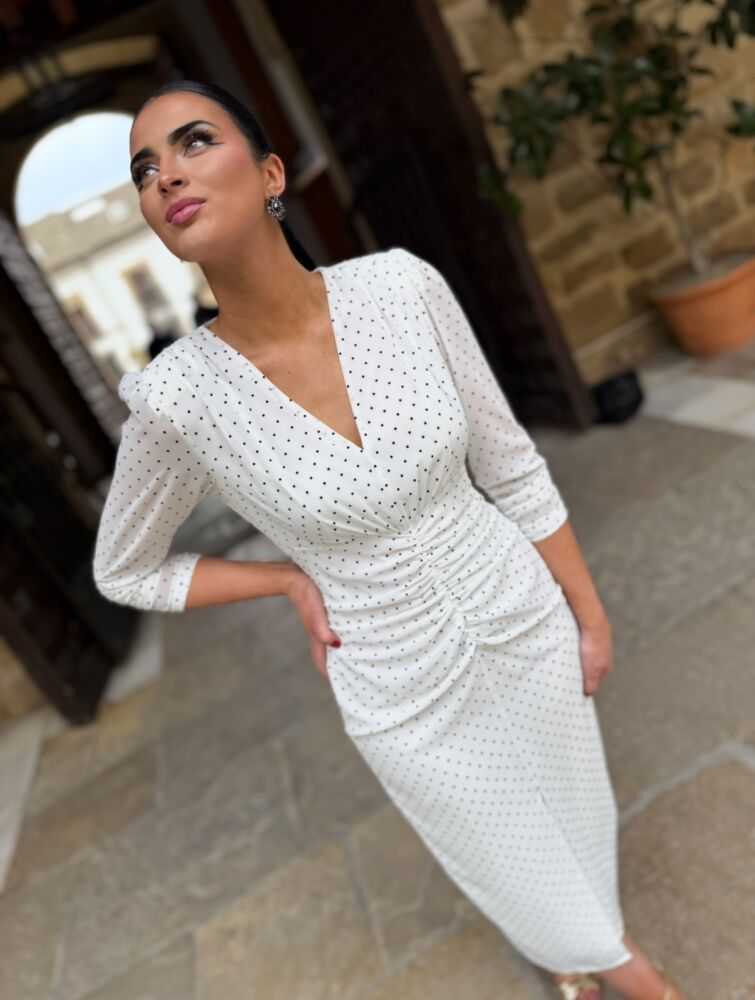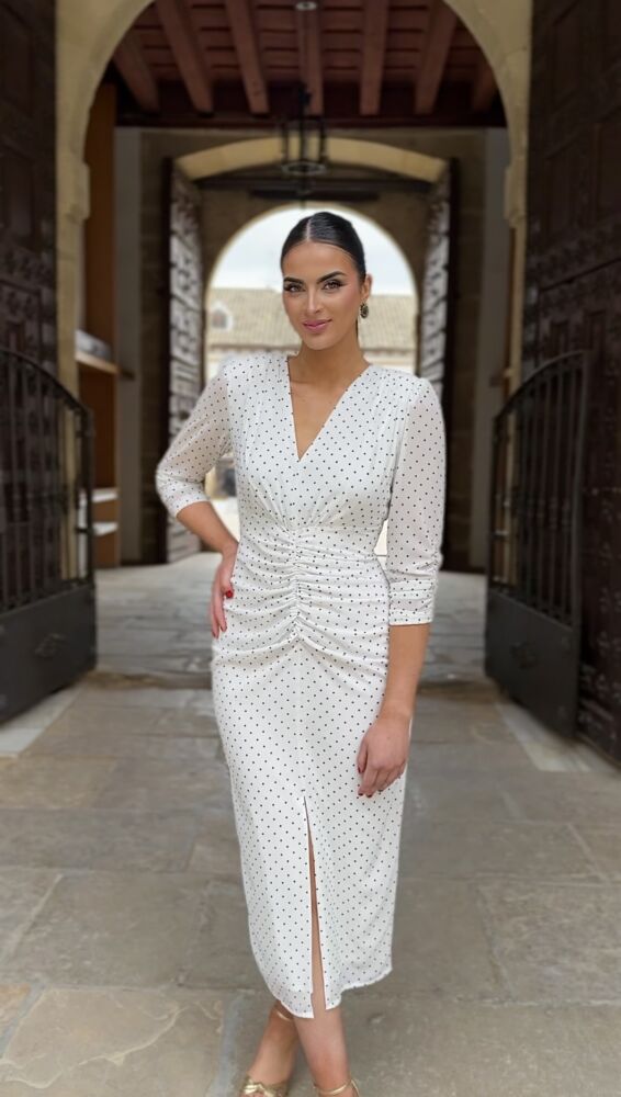 Vestido midi en tejido gasa forrado al tono de color blanco con topos negros forrado al tono. El toque de distinción lo marca el escote pico, el drapeado y la raja frontal. Un vestido muy dulce y elegante para arrasar en tu evento como invitada perfecta.