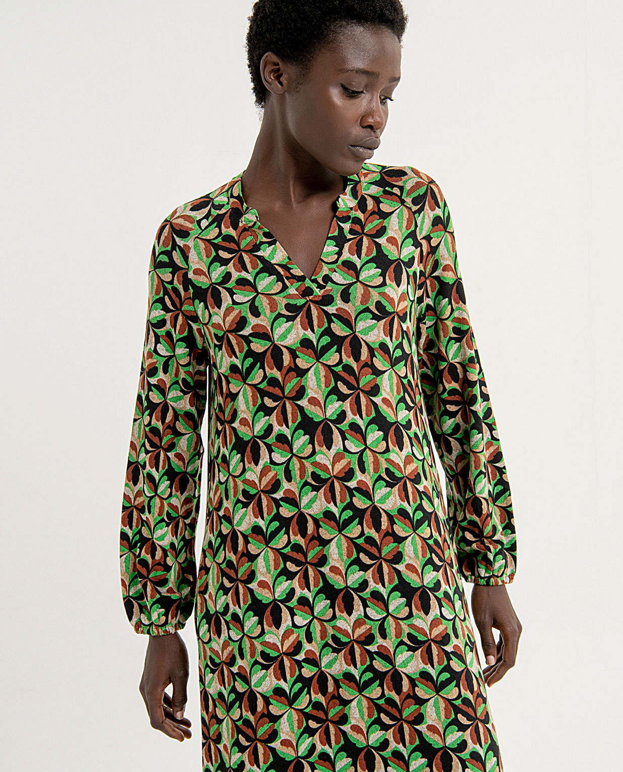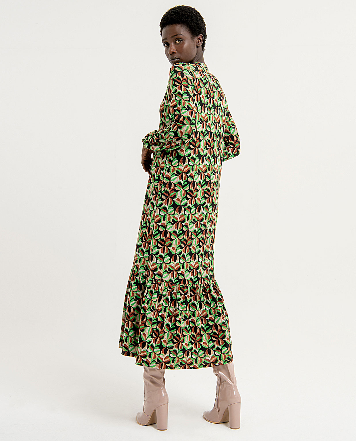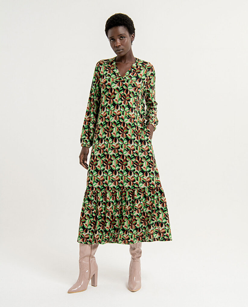 Vestido largo y amplio con estampado en colores verdes y marrones, de manga larga con volumen y cuello mao con escote en «v». Vestido con volante en el bajo y bolsillos tipo ojal en los laterales. Composición 50% poliéster reciclado, 45% poliéster y 5% elastano.