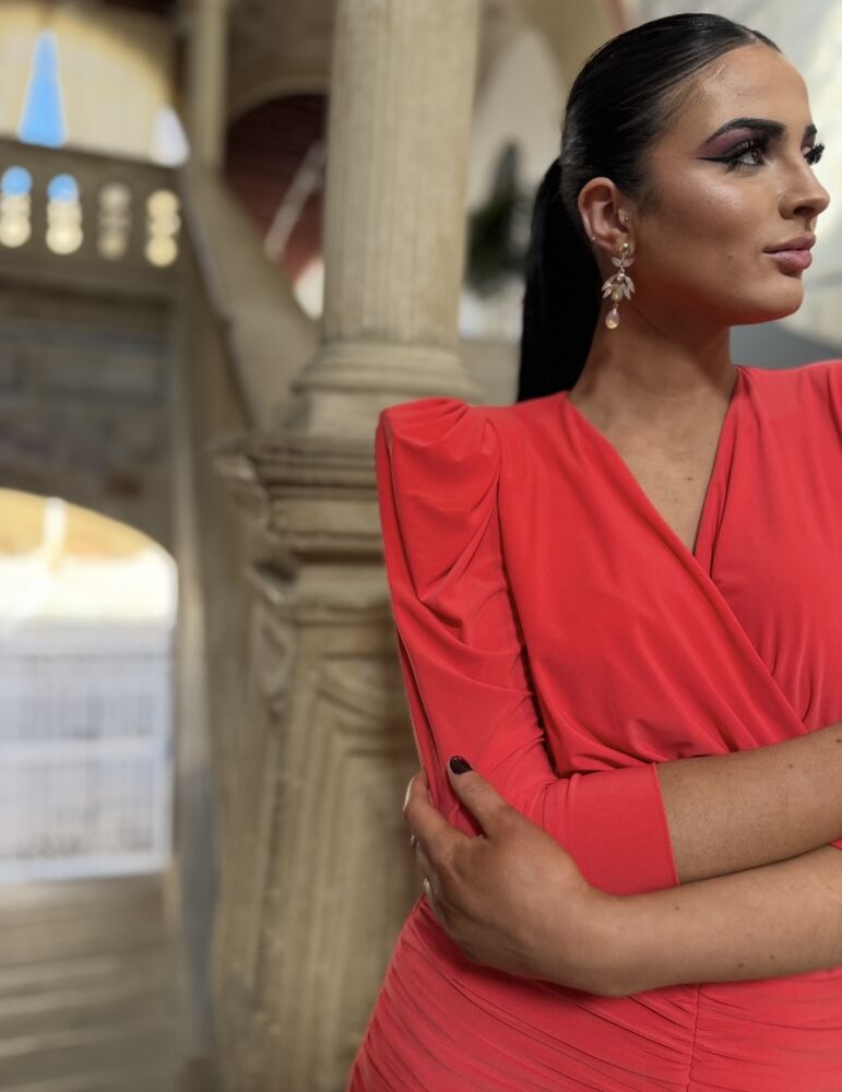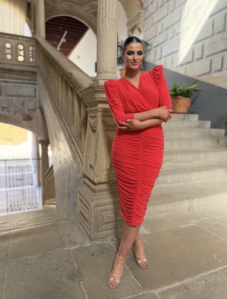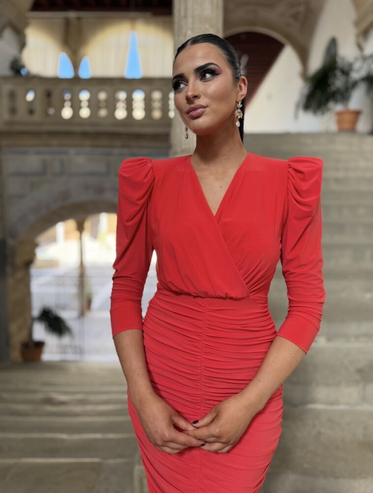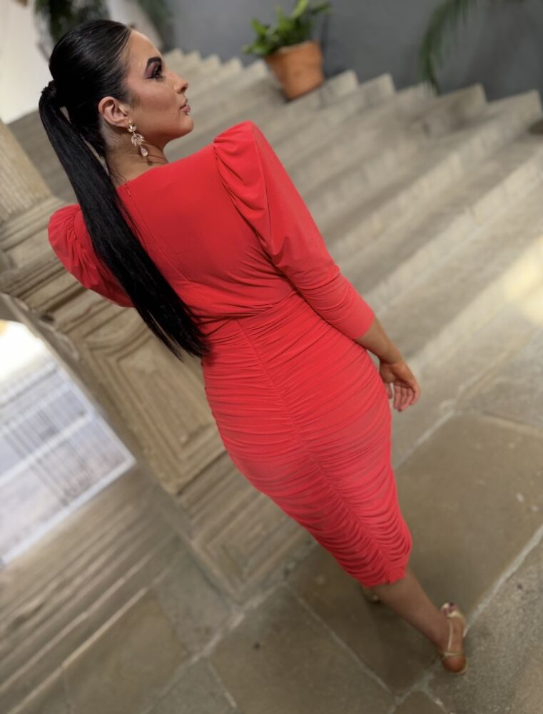 Vestido midi en punto de seda de color coral forrado al tono. El toque de distinción lo marca el drapeado de todo el cuerpo, el escote pico y la espalda tan elegante que tiene. Un vestido muy elegante para arrasar como invitada perfecta.