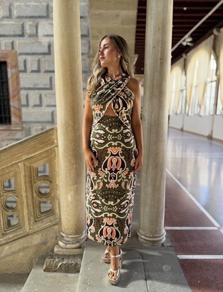 Vestido midi en tejido lino sintético forrado al tono de color verde oliva estampado. El toque de distinción lo marca el cuello halter cruzado, el “cut” en pecho y la espalda tan cuidada. Un vestido espectacular para arrasar como invitada perfecta.