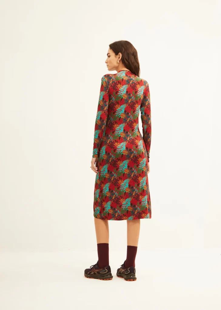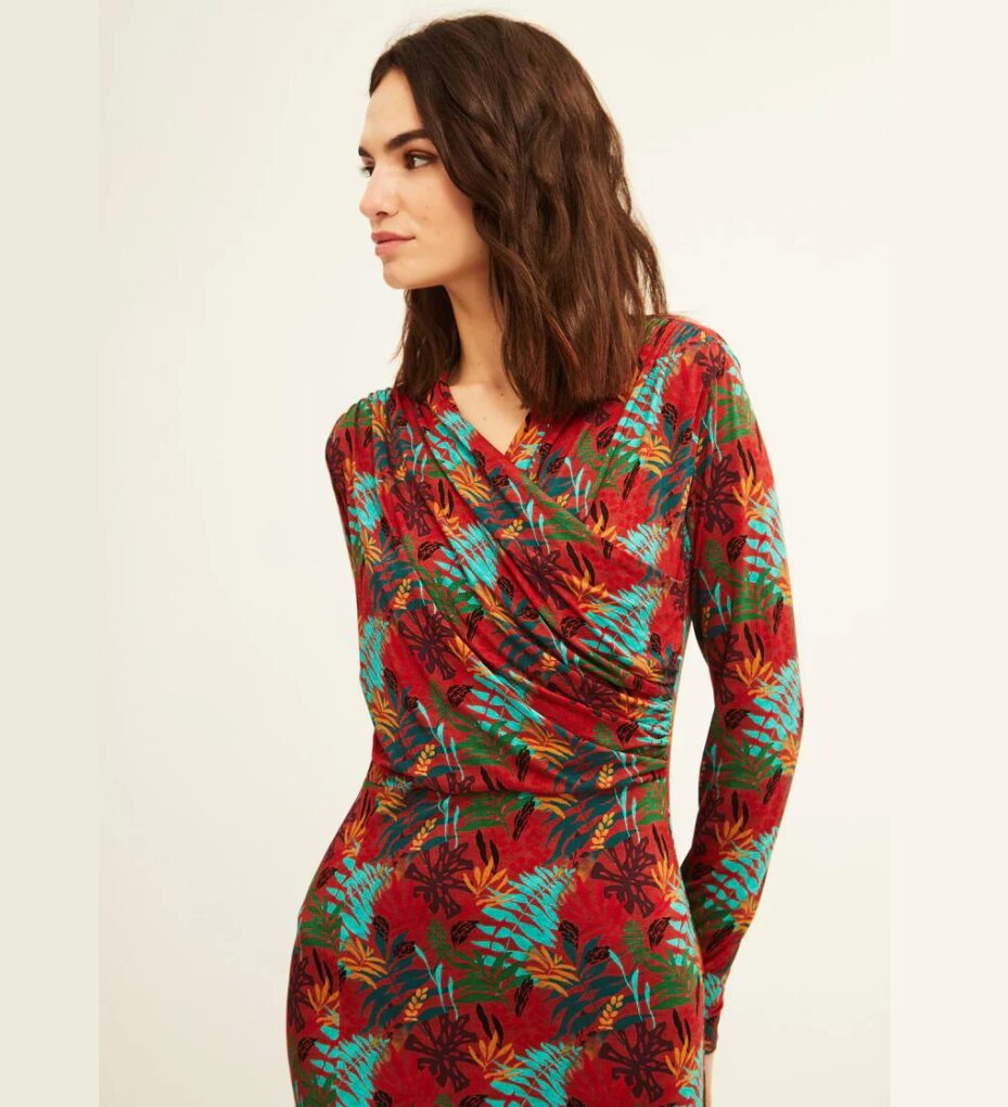 Vestido de largo midi con apertura lateral, de manga larga, cuello en pico drapeado y cruzado. Su composición es 95% viscosa y 5% elastano.