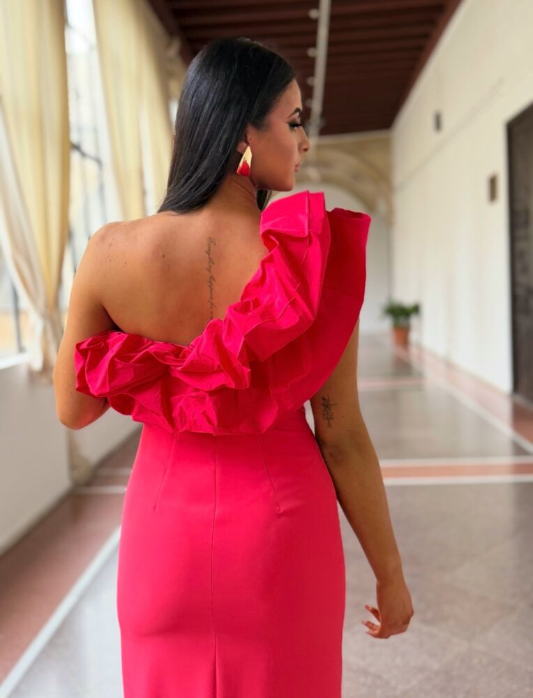 Vestido midi en tejido crepe forrado al tono de color fresa. El toque de distinción lo marca la asimetría de la manga, el volantón en tafetán del pecho y el volante de la falda. Un vestido espectacular para arrasar como invitada perfecta.