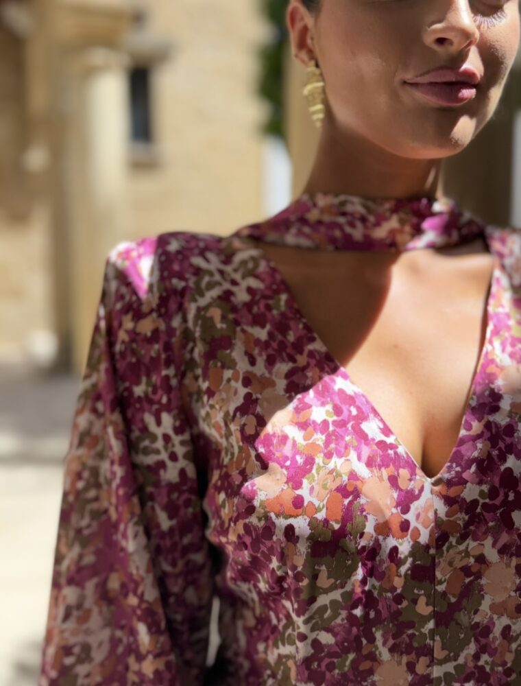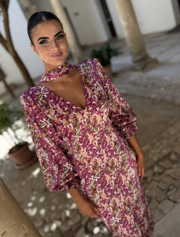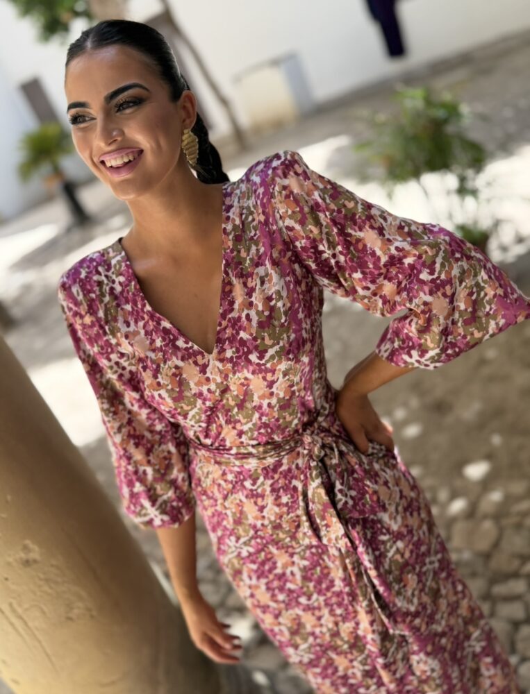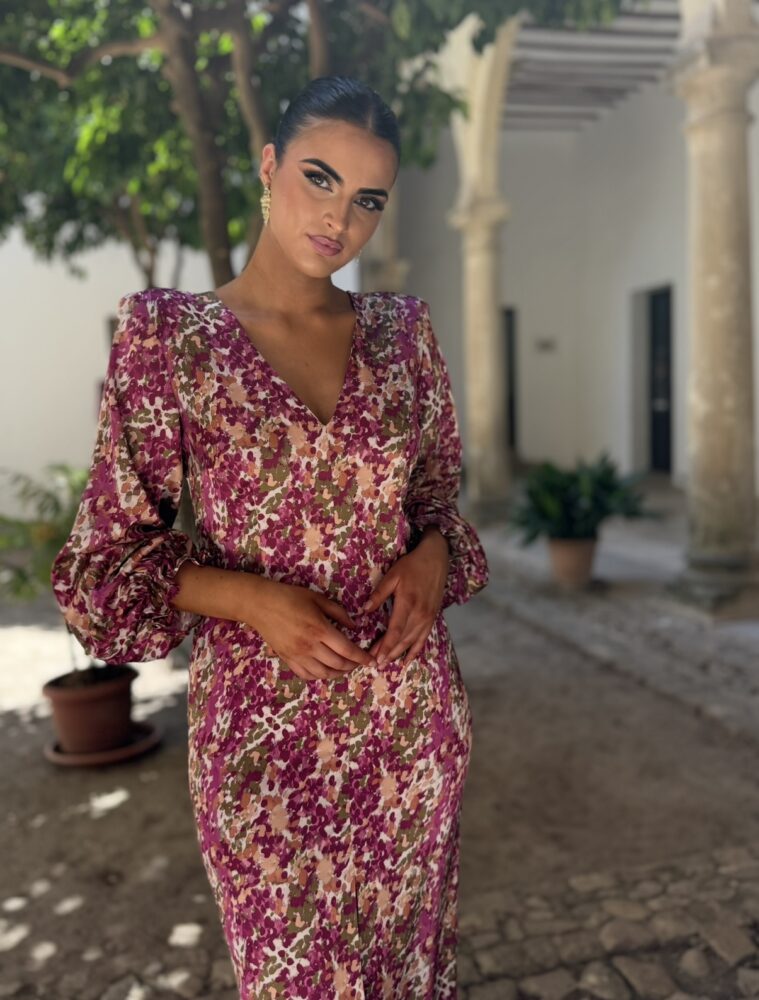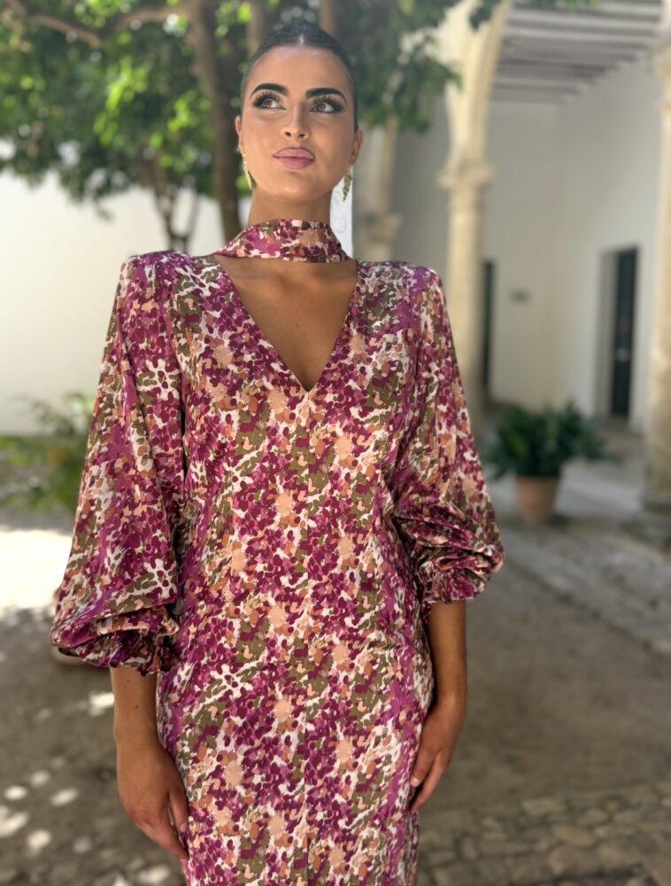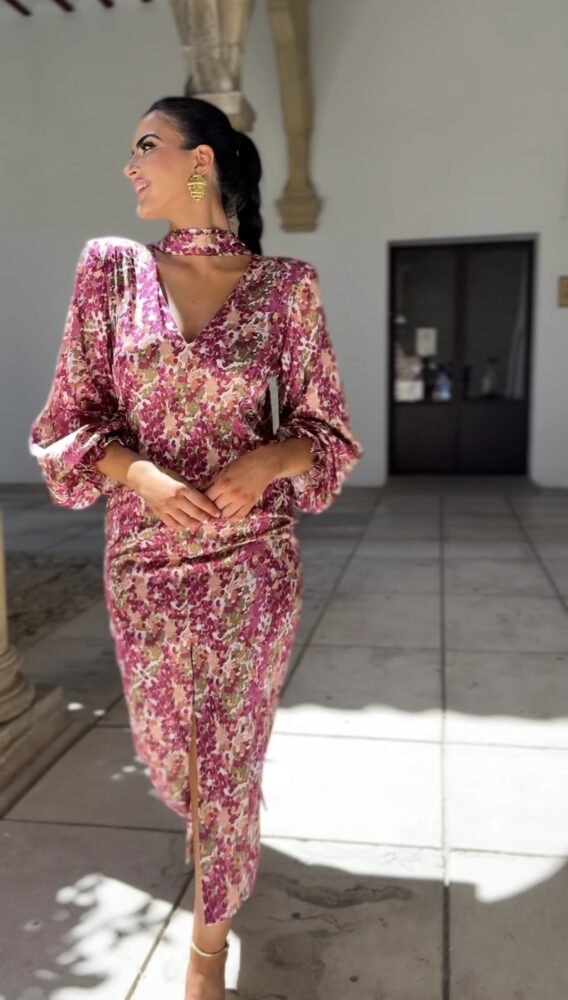 Vestido midi en tejido satén estampado forrado al tono. El toque de distinción lo marca el escote pico, las mangas barrocas modulares, la raja frontal en falda y la banda que puede ir en el cuello o en cinturón. Un vestido muy elegante para brillar en tu evento.