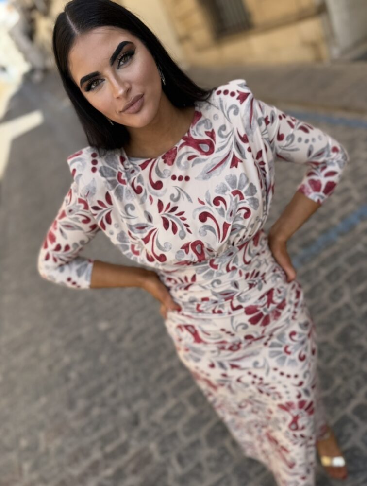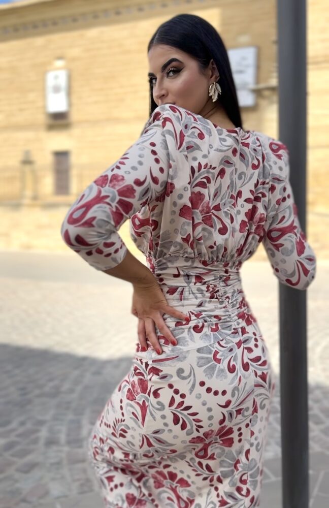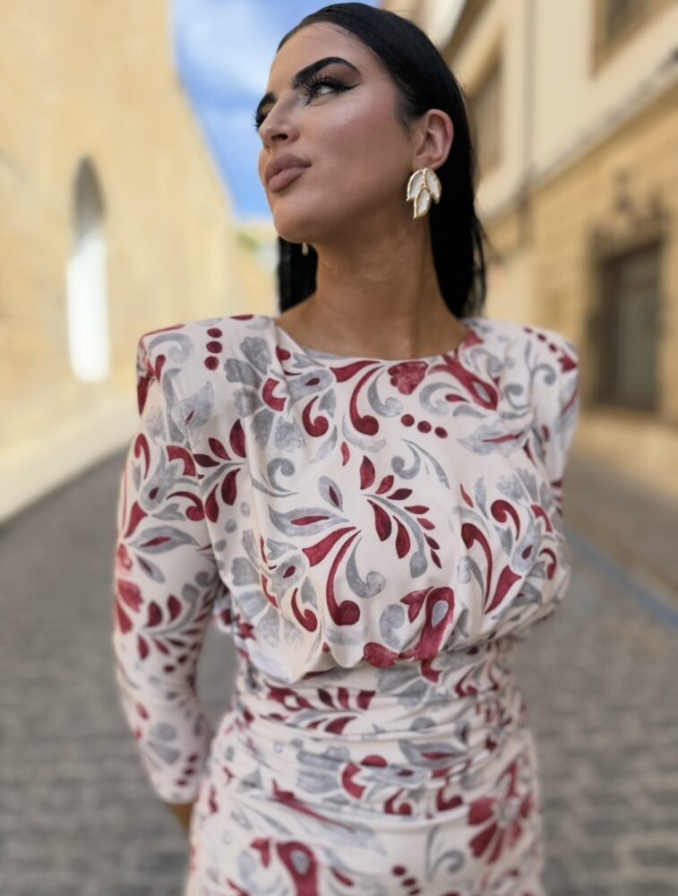 Vestido midi en tejido punto de seda forrado al tono. El toque de distinción lo marca la hombrera marcada tipo rugby, los drapeados en cintura y espalda y la falda en evasé. Un vestido muy elegante y versátil para arrasar como invitada perfecta.