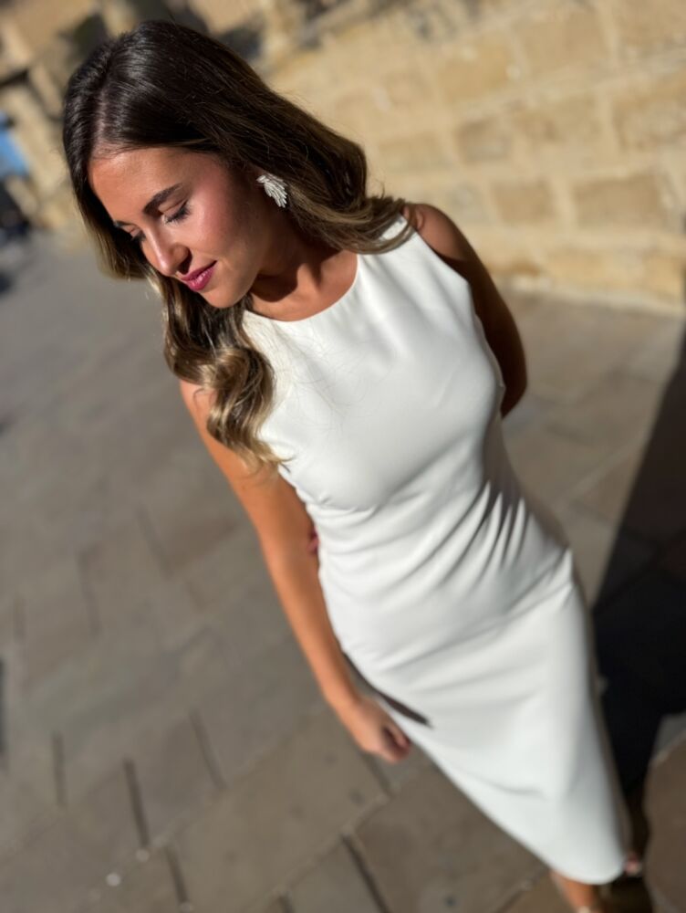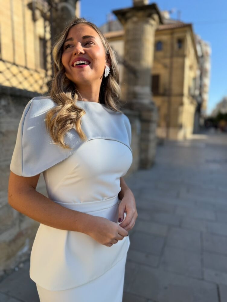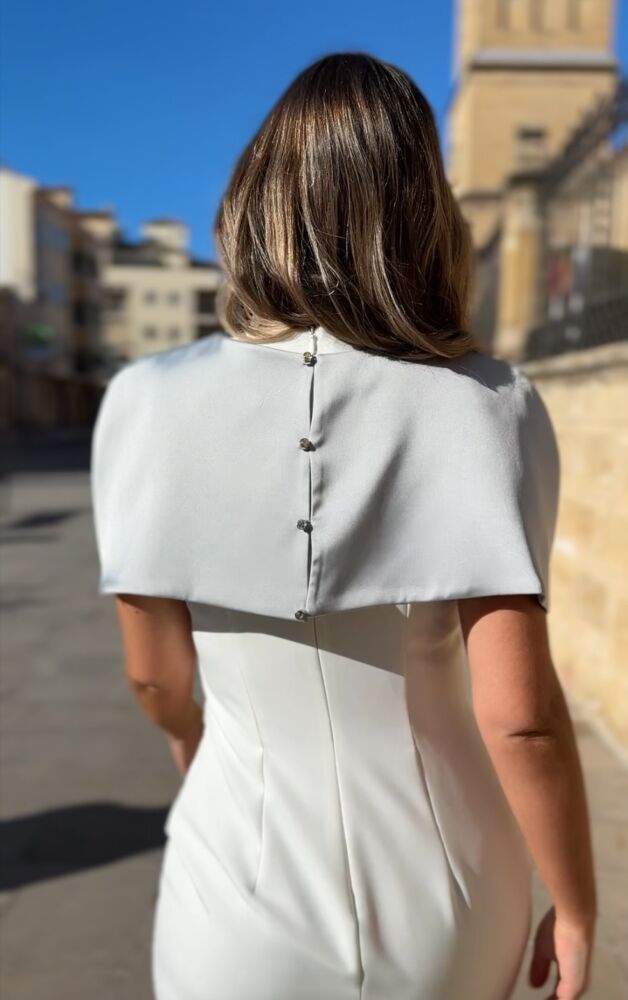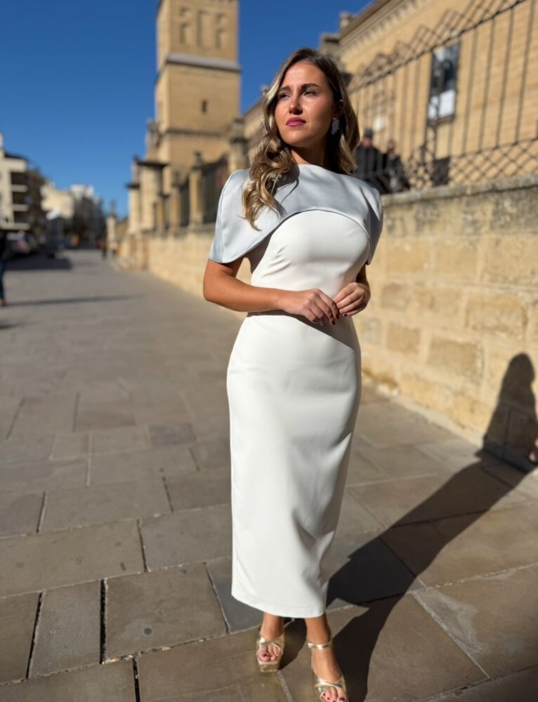Vestido midi de color blanco y azul celeste. El toque de distinción lo marca la originalidad del diseño ya que consta de tres partes. La primera es una vestido sencillo blanco forrado al tono con manga a la sisa. La segunda es un faldón peplum que se ajusta como un cinturón. ¡Ideal para tapar tripita! Y la tercera es una capa de satén mate de color azul pastel con botonadura trasera. Un vestido espectacular para arrasar como invitada perfecta.