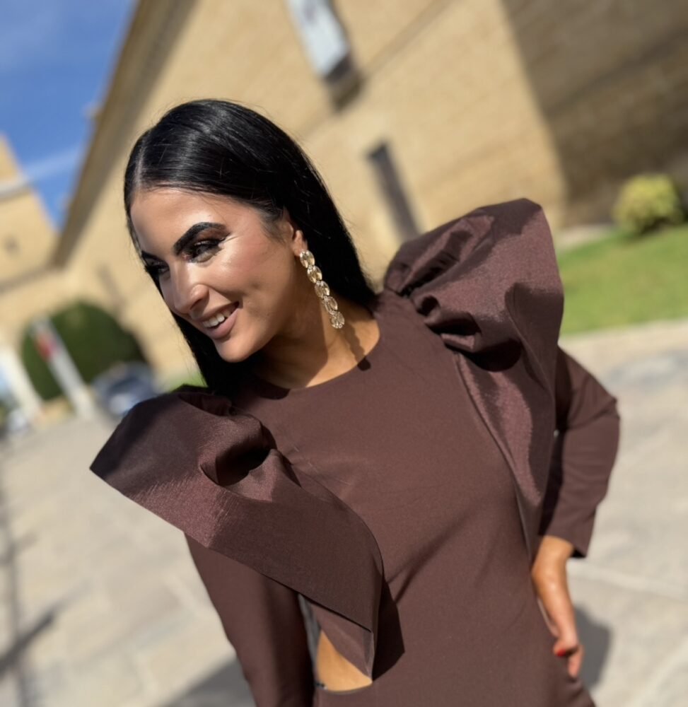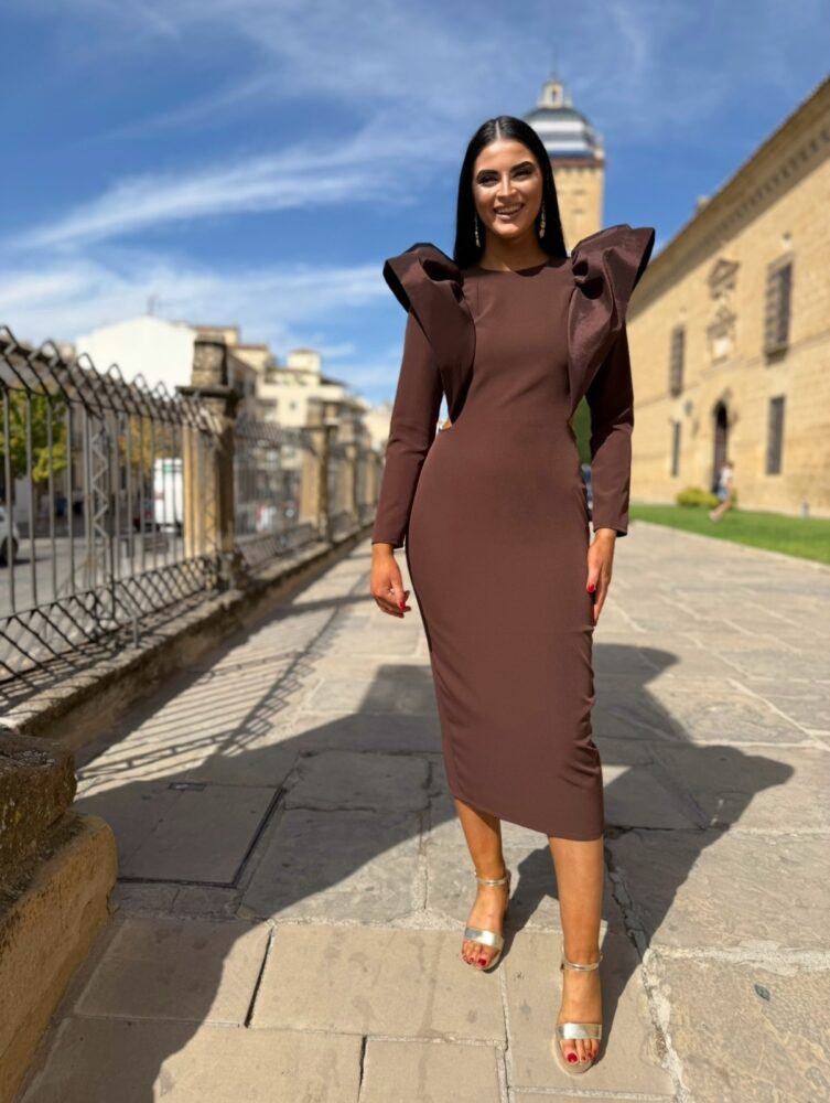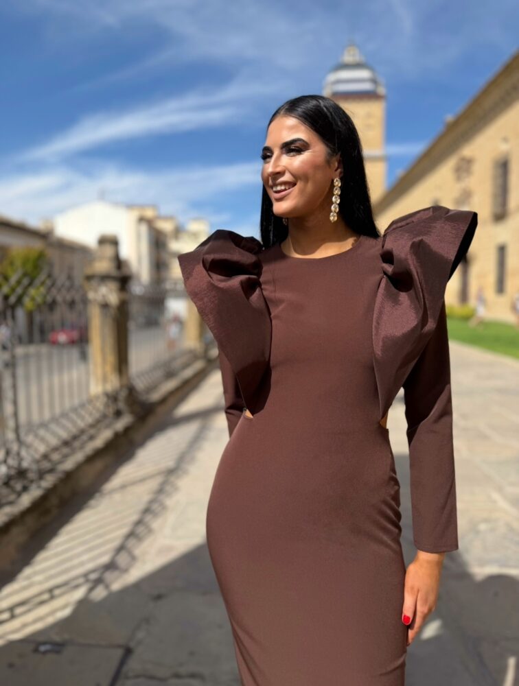 Vestido midi en tejido crepe forrado al tono de color marrón chocolate. El toque de distinción lo marca las volumetrías en tafetán de la parte frontal y la espalda al aire tan protagonista.