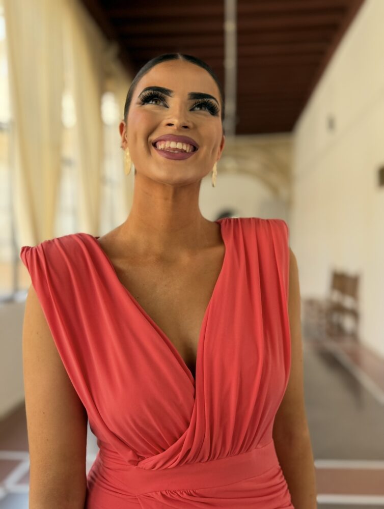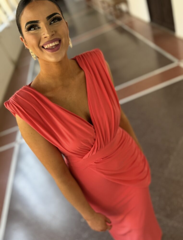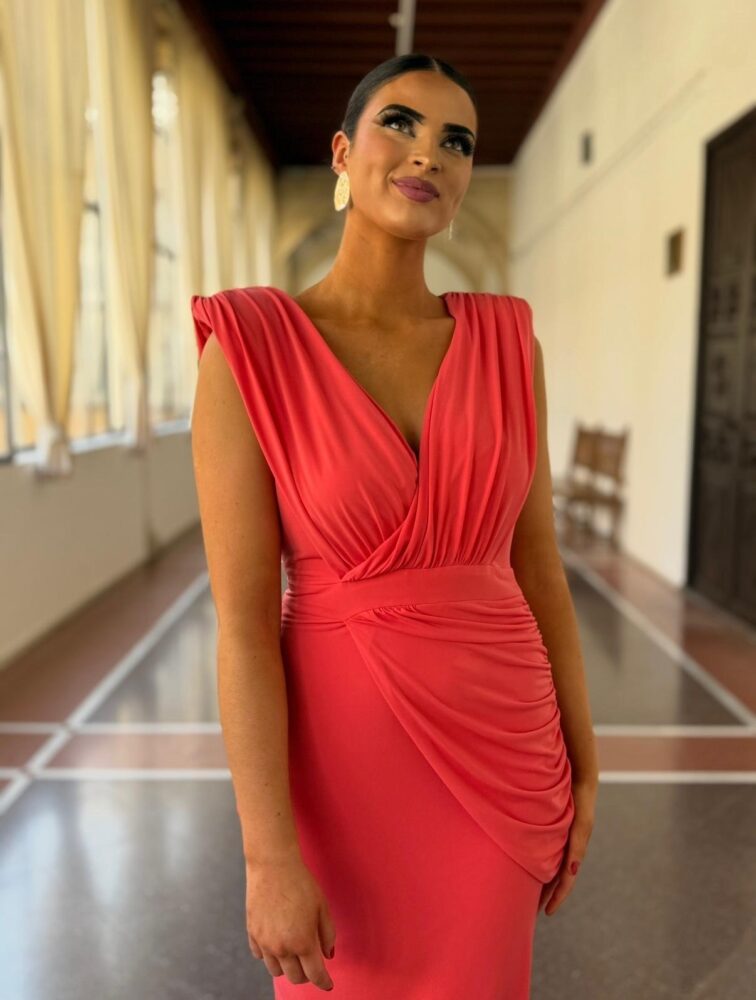 Vestido midi en tejido punto de seda forrado al tono. El toque de distinción lo marca el escote pico, los drapeados de la parte superior y el peplum en cintura. Un vestido súper elegante para arrasar como invitada perfecta.