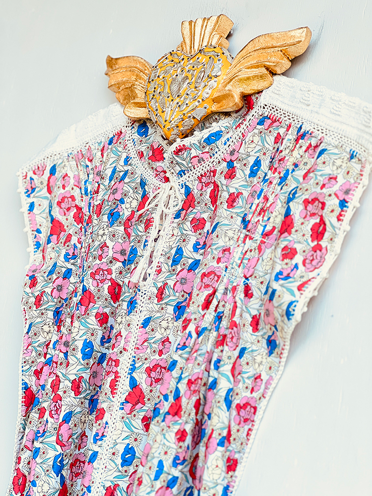 Ni un verano sin flores! Confeccionado en algodón con uniones en crochet hechas a mano. Talla única.