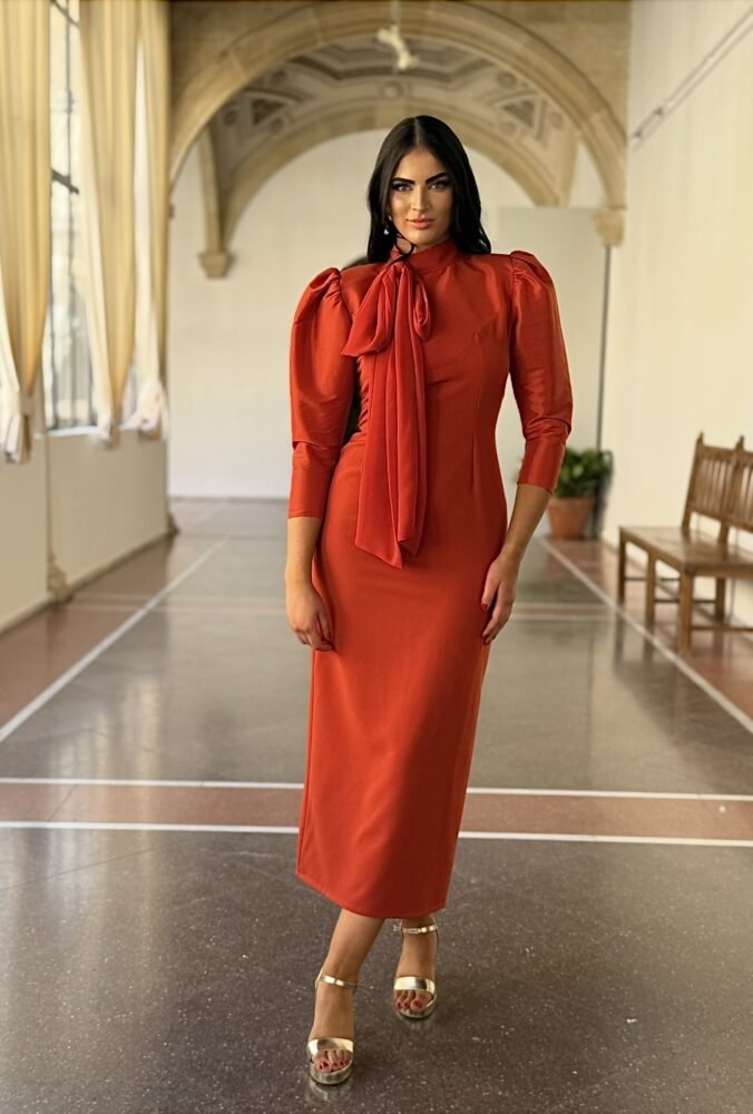Vestido midi en color caldera forrado al tono. El toque de distinción lo marca la lazada en el cuello de gasa y el tafetán de la parte superior. Es un vestido de corte recto con raja trasera. Una prenda súper elegante para arrasar como invitada perfecta.