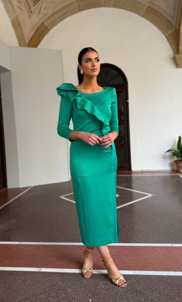 Vestido midi en tejido satén verde forrado al tono. El toque de distinción lo marca el volante lateralizado del vestido, la raja frontal y el patrón tan femenino que tiene. Un vestido para arrasar como invitada perfecta.