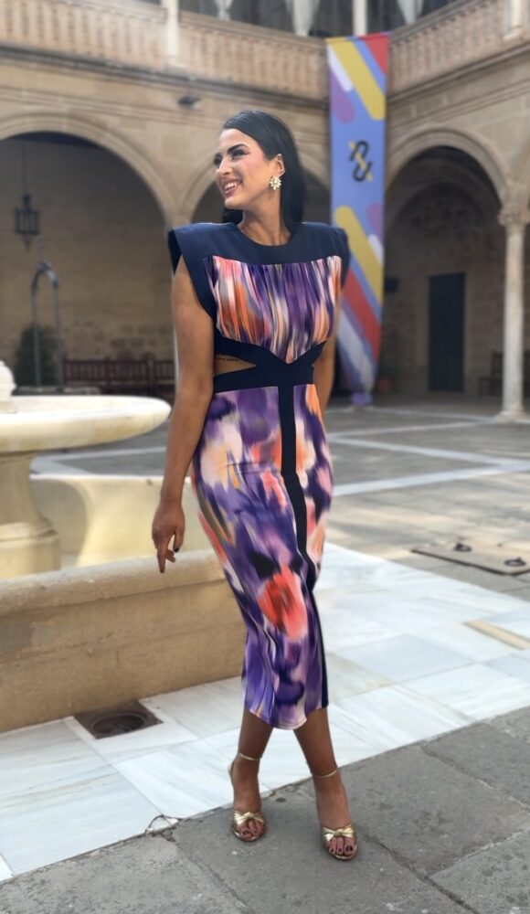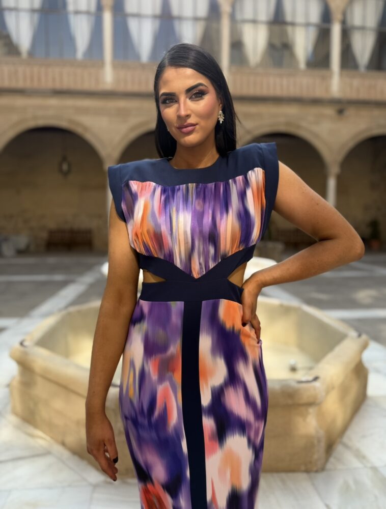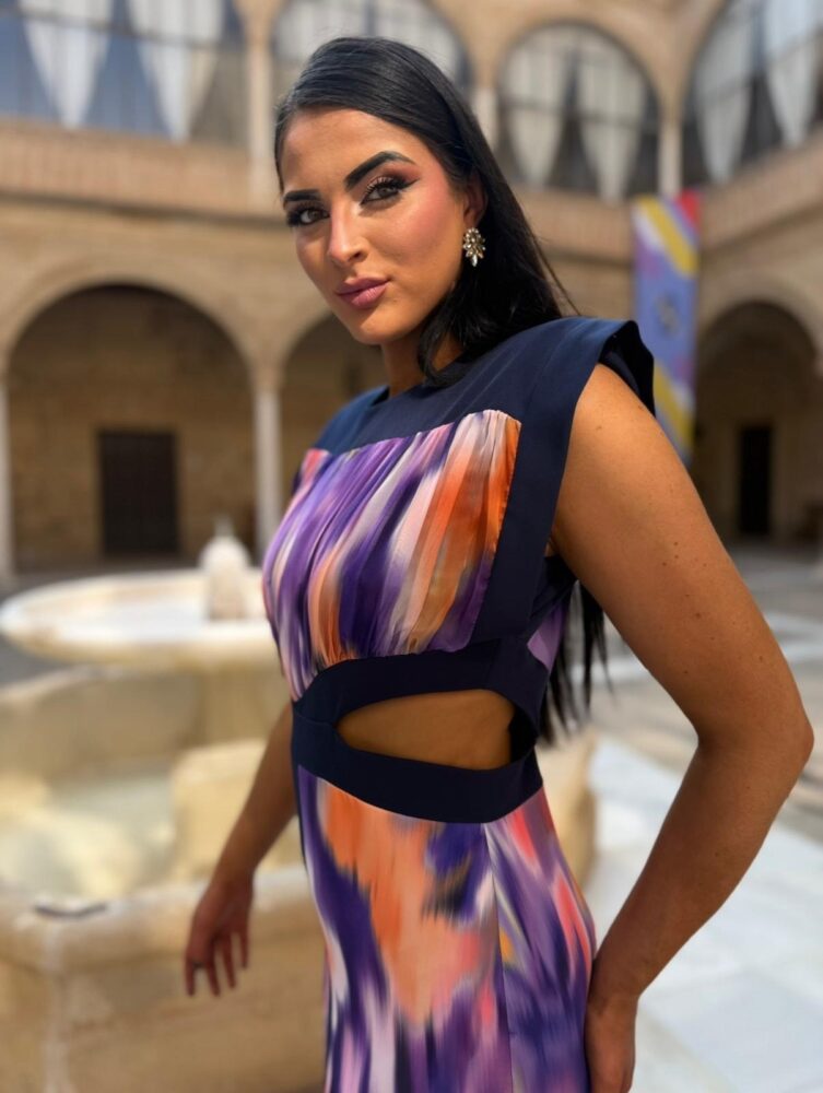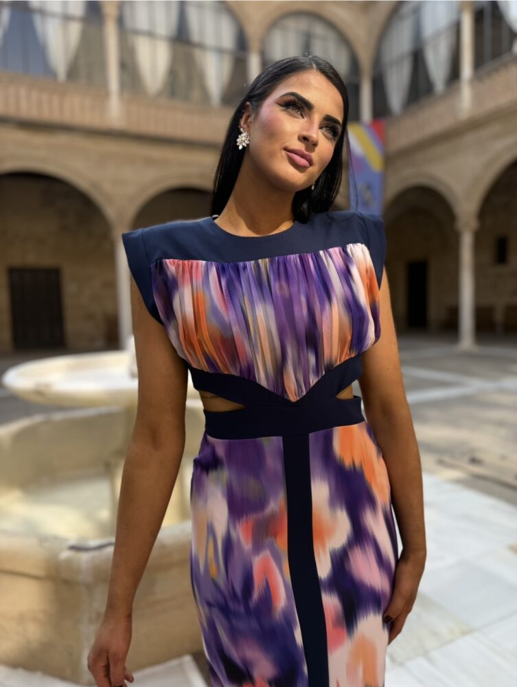 Vestido midi en tejido crepe con gasa forrado al tono. El toque de distinción lo marca la originalidad del diseño con el “cut” en cintura y el estampado “tie dye” en tonos morados, naranjas y azules marino.