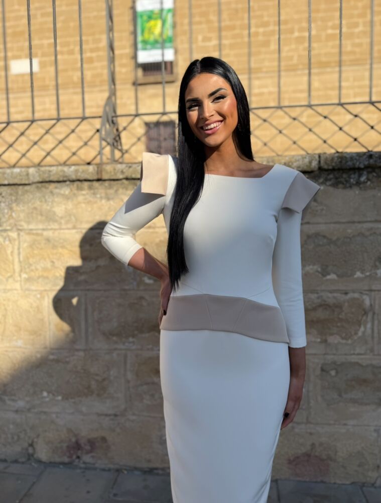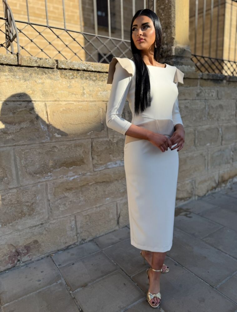 Vestido midi en tejido crepe de color crema forrado al tono. El toque de distinción lo marcan las solapas del hombro y el fajín en cintura de color camel. El contraste de colores es muy elegante y original para arrasar como invitada perfecta.