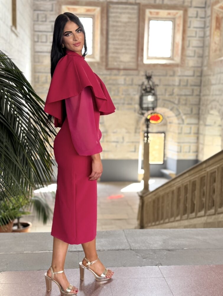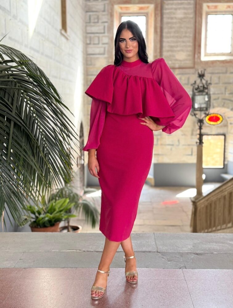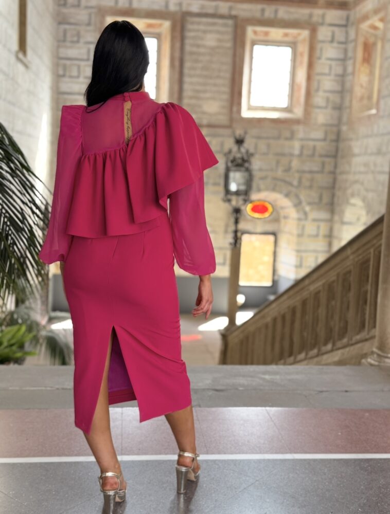 Vestido midi en tejido crepe de color rosa forrado al tono. El toque de distinción lo marca el volantón de toda la zona superior, la asimetría de la manga y la combinación de tejidos (gasa y crepe).