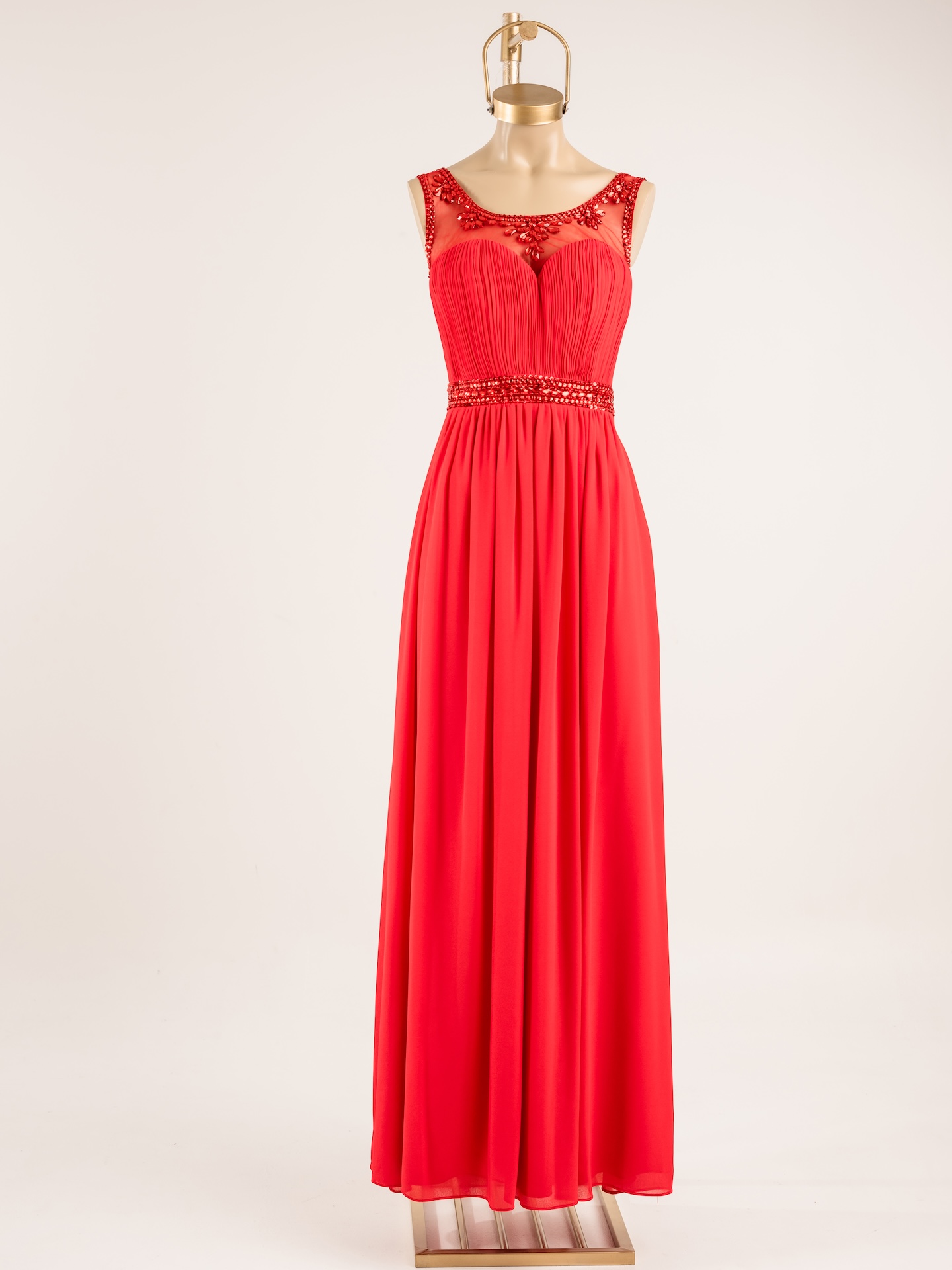 Vestido largo escote cerrazón de gasa con busto fruncido y detalles bordados en escote y cintura. Transparencia en el escote con apliques que aportan un toque sofisticado. Ideal para madrinas, eventos formales o fiestas elegantes.