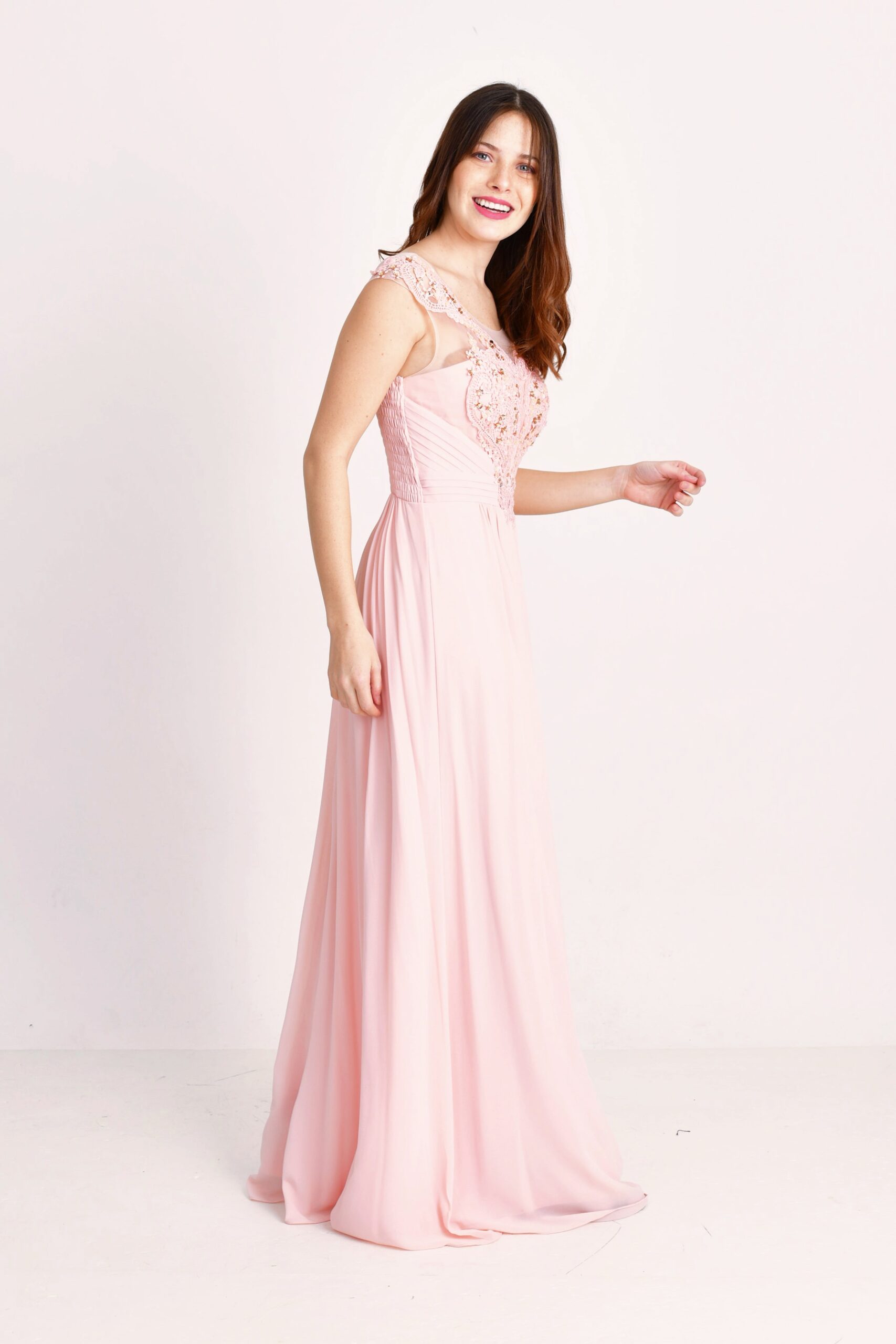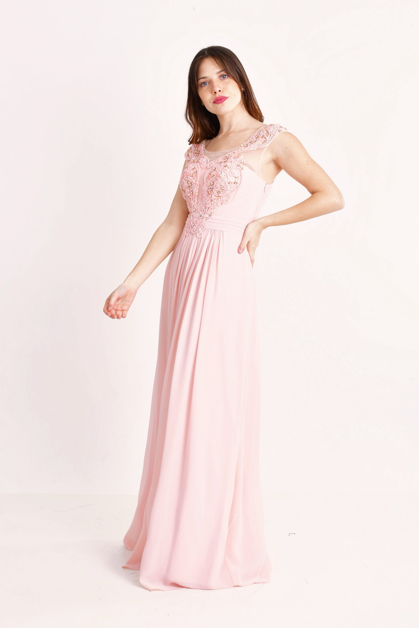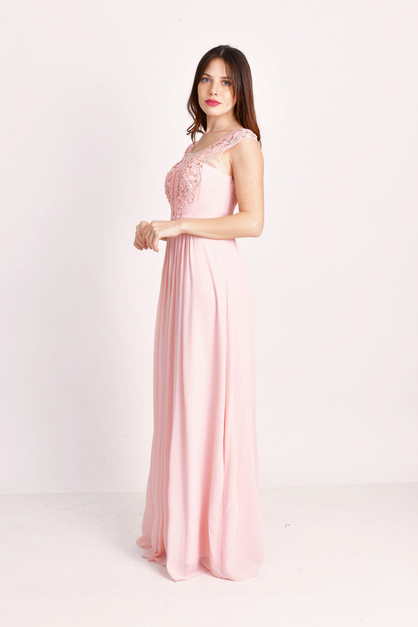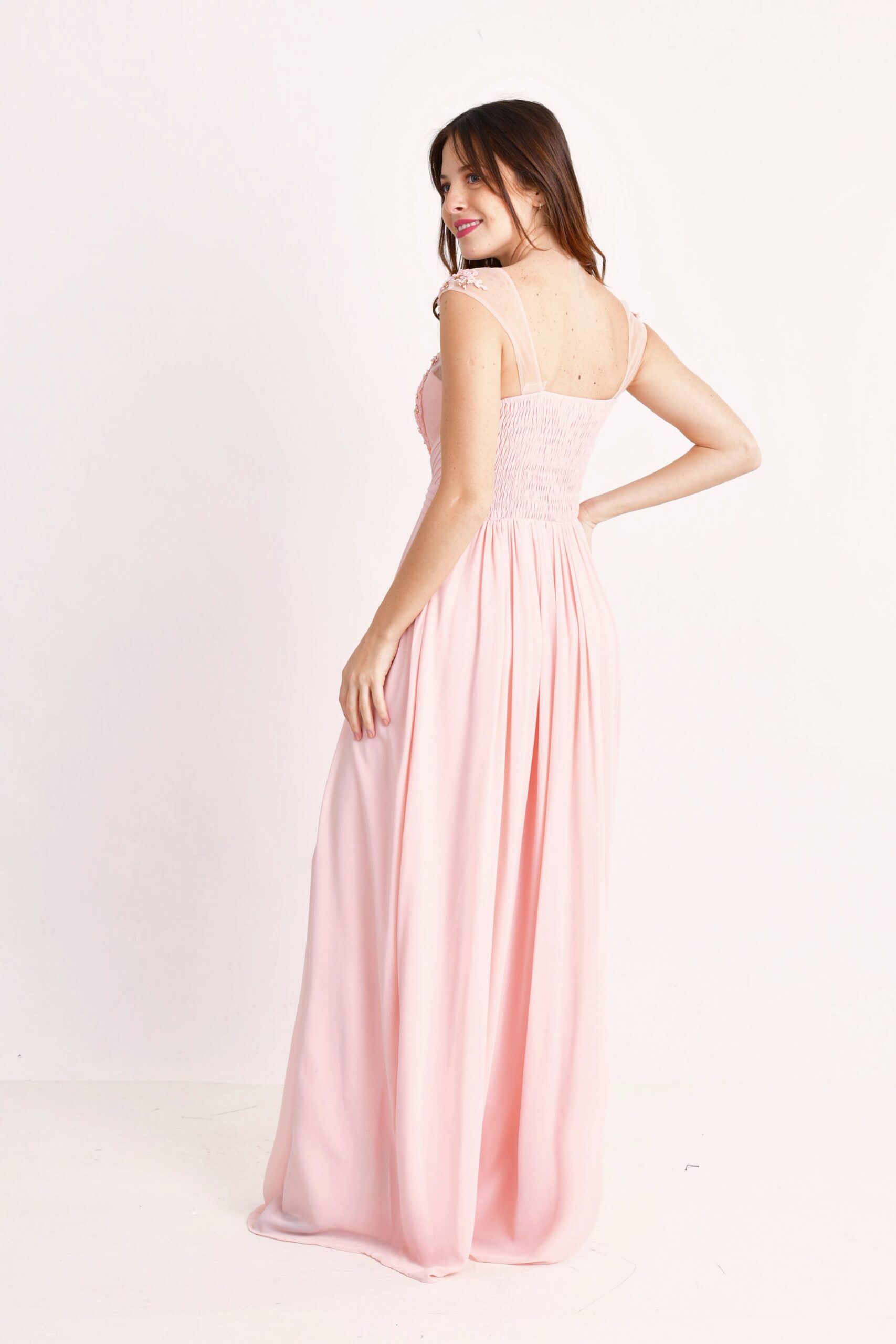 Vestido largo de gasa bordado con recorte delantero y drapeado en la cintura que brinda amplitud a la falda.